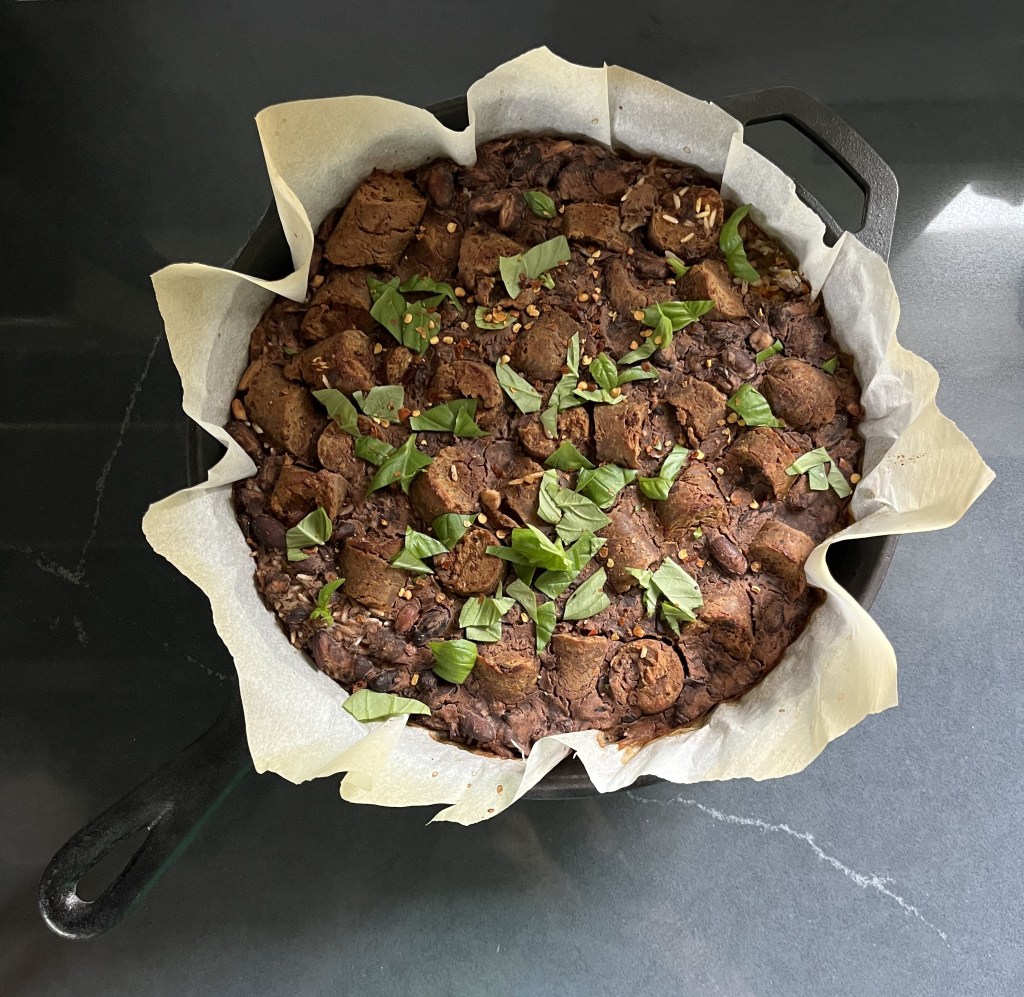 stir in parchment-lined cast-iron pan; place in cold oven set to 450 F, 1 hour; top with basil+red pepper flakes